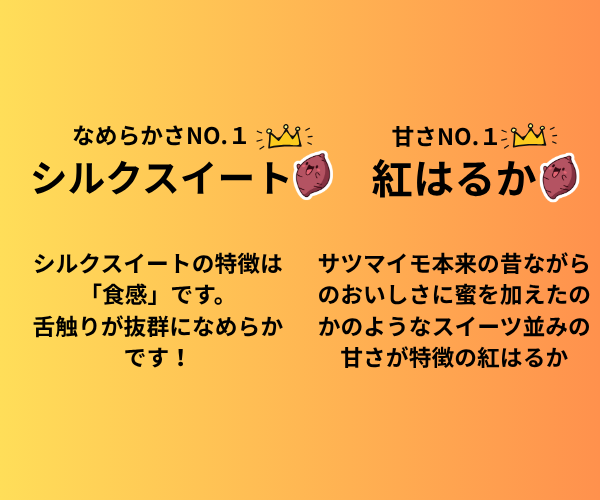 全体のバランスがよく総合力NO.1の安納芋・甘さNO.1の紅はるか・なめらかさNO.1のシルクスイートというイメージです。